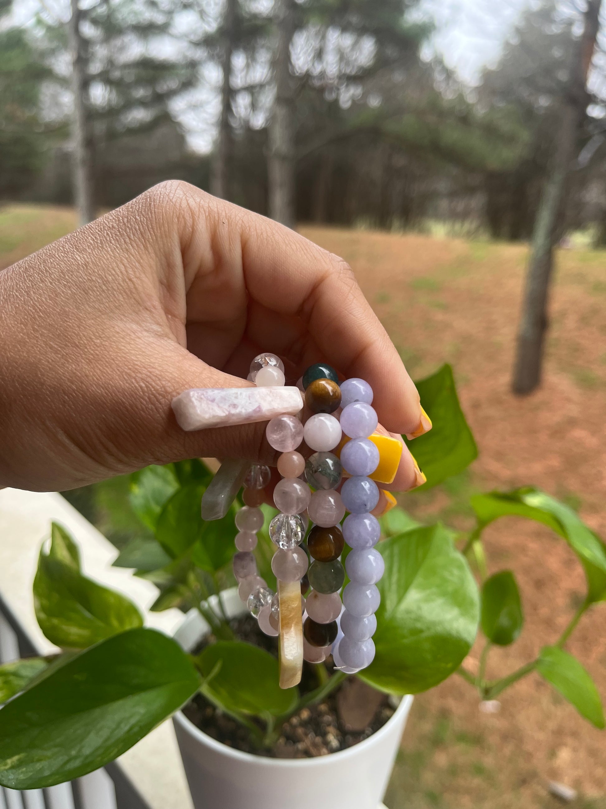 Made with opal, moss agate, cracked quartz, rose quartz, morganite, aqua jade, and tigers eye.